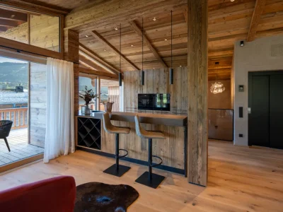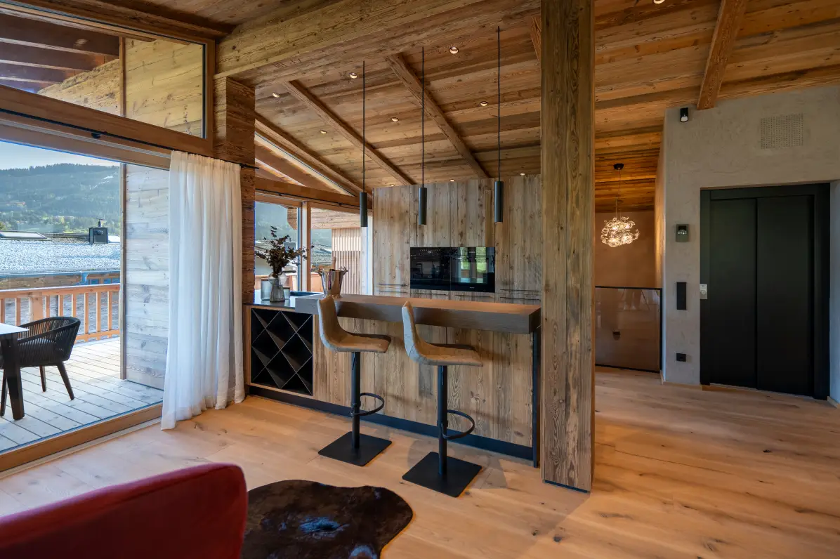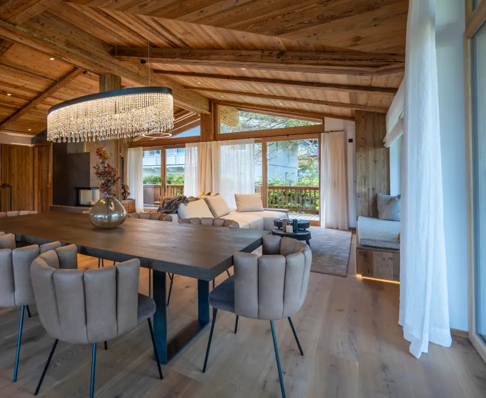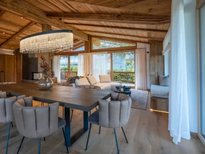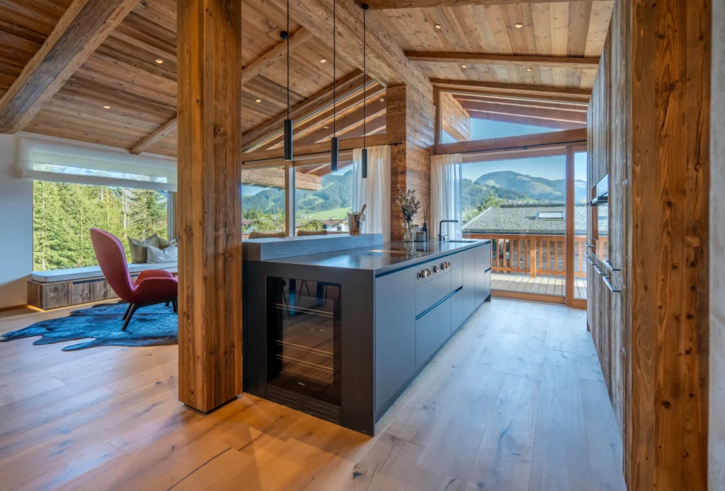 The top floor features an open-plan living and dining area with views of the majestic Wilder Kaiser mountain. The modern, fully equipped kitchen invites you to conjure up culinary delights. A spacious dining area offers space for convivial evenings.