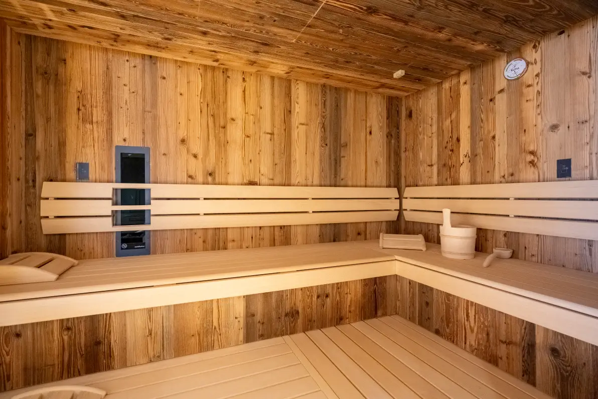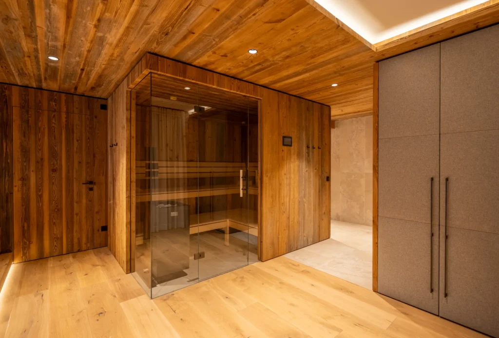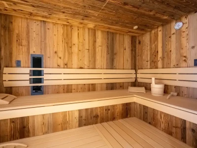 The chalet extends over several levels and impresses with its unique architecture. A cozy wellness area awaits you on the first floor, which offers relax and recovery with a sauna, relaxation zone and space for your personal fitness.